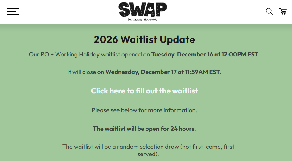 Below is a screenshot from SWAP, where the application waitlist was full after just 30 minutes of the opening date for the 2025 Working Holiday season.