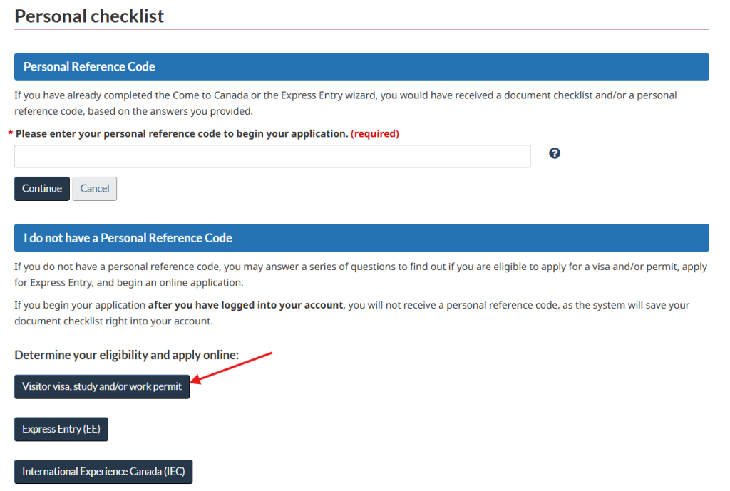 - If you do not see the button “Visitor visa, study and/or work permit” you can get a reference code through this link, answer a few questions, then use the code you receive in the field “Personal Reference Code”