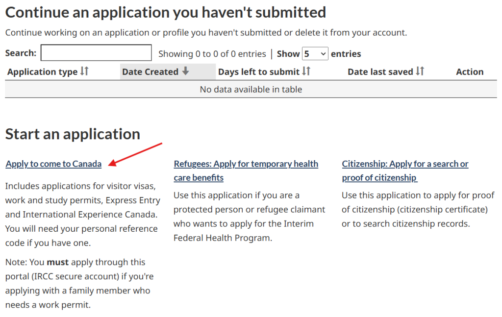 - Click on the link “Apply to come to Canada“ under “Start an application“.